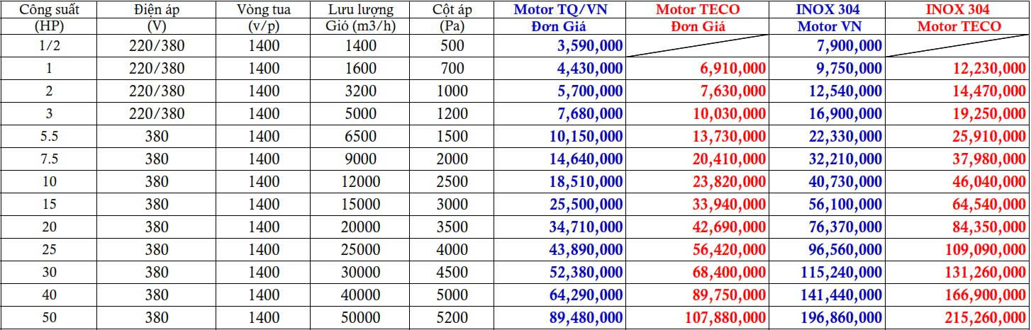 Bảng giá quạt hút ly tâm thấp áp được cập nhật mới nhất